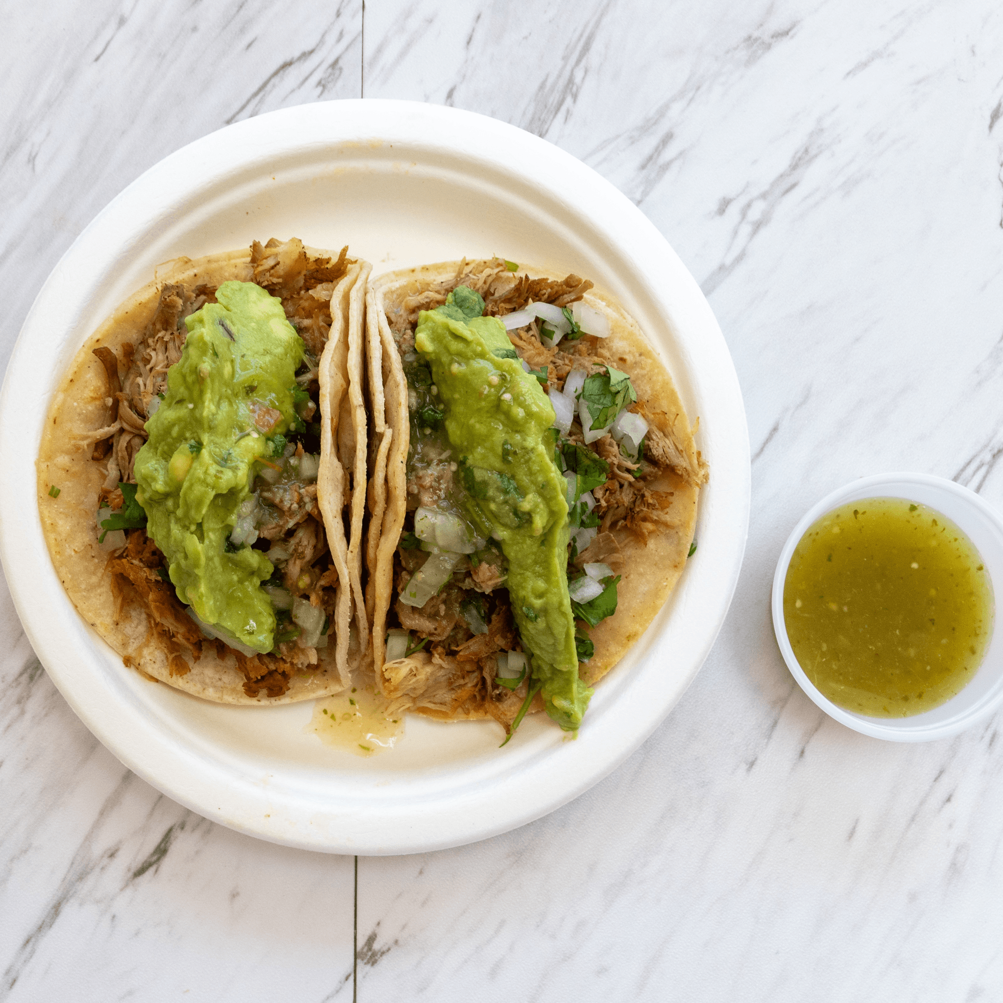 Two corn tortillas filled with tender pulled pork, fresh chopped onion, cilantro, fresh guacamole, and your choice of hot or mild salsa.