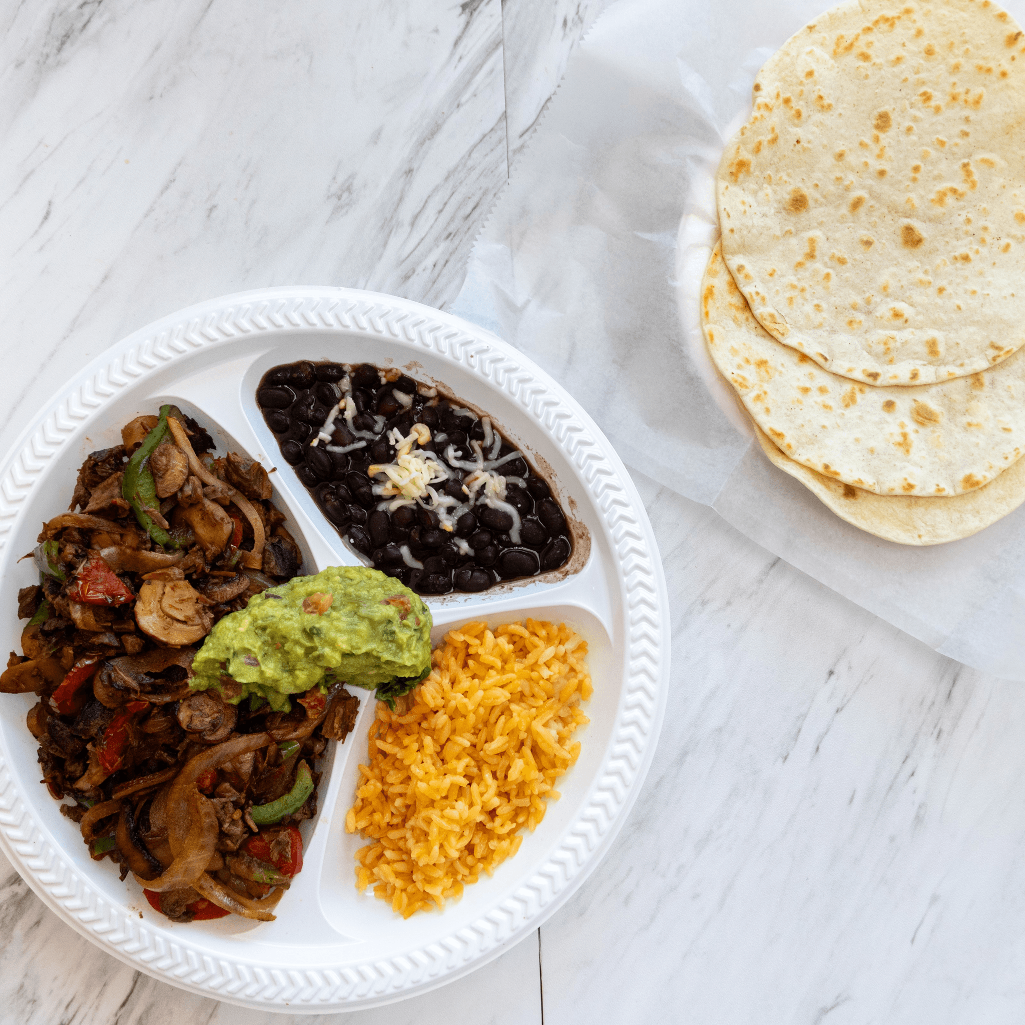 A colorful blend of sautéed peppers, onions, mushrooms, and tomatoes with rice, beans, melted cheese, fresh guacamole, and warm flour tortillas.