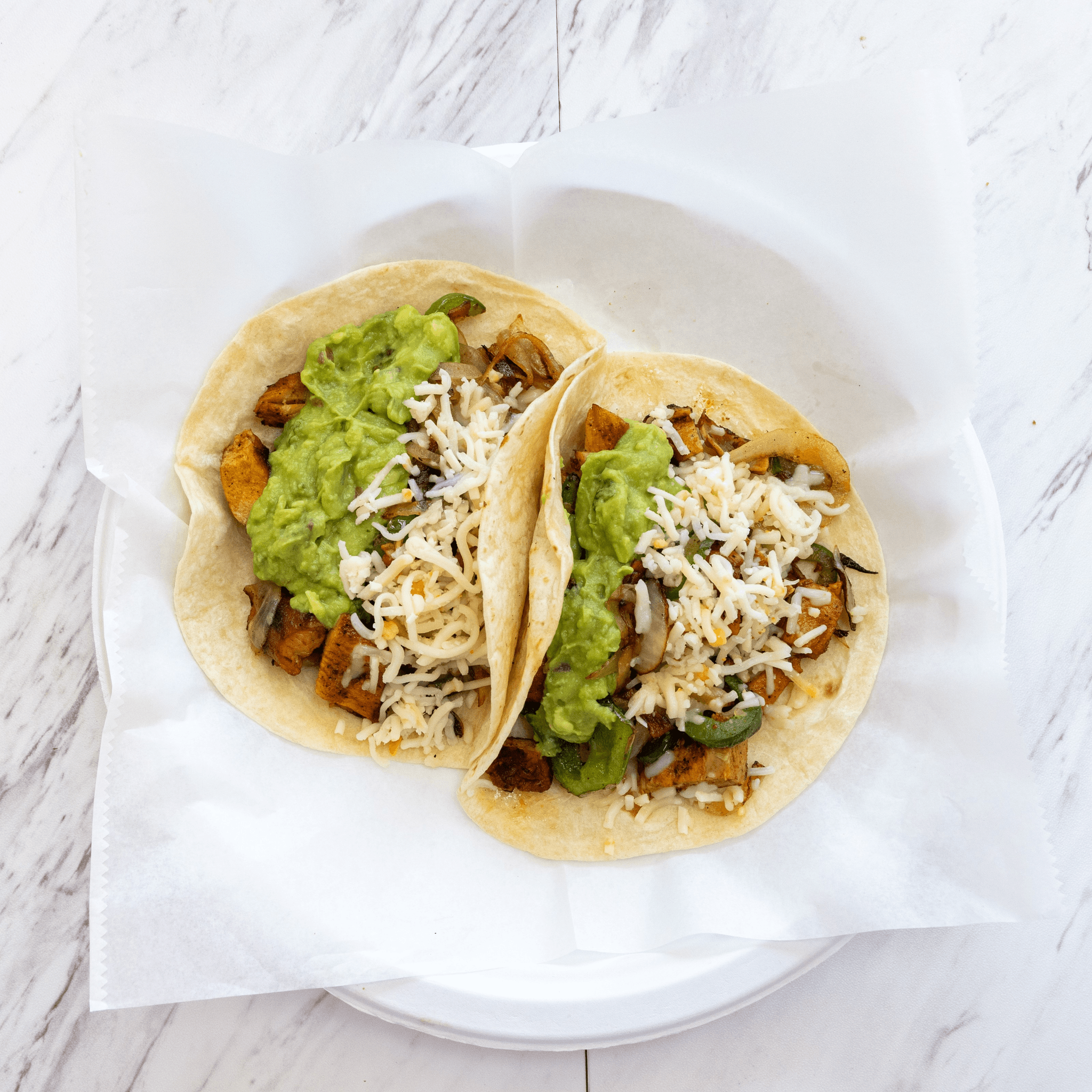 Two tacos with sautéed onions and peppers, fresh guacamole, and jack cheese in a flour tortilla.