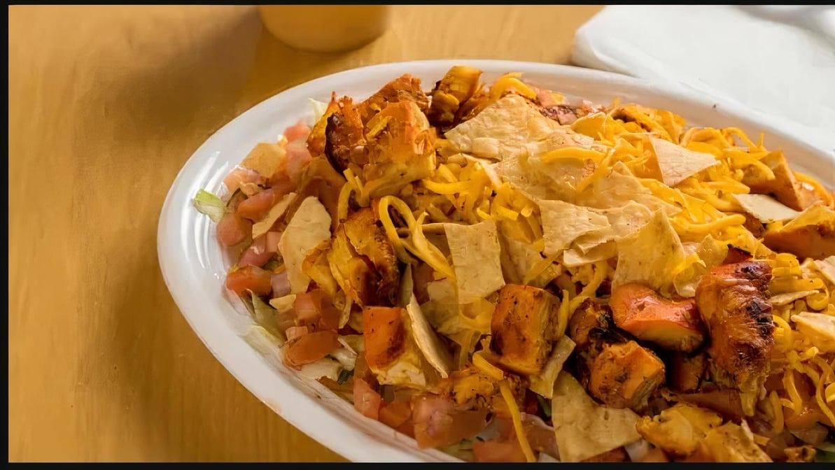 Tender charbroiled chicken served over fresh lettuce with crunchy crushed corn chips, fresh tomato salsa, shredded cheddar cheese, and Italian dressing on the side.