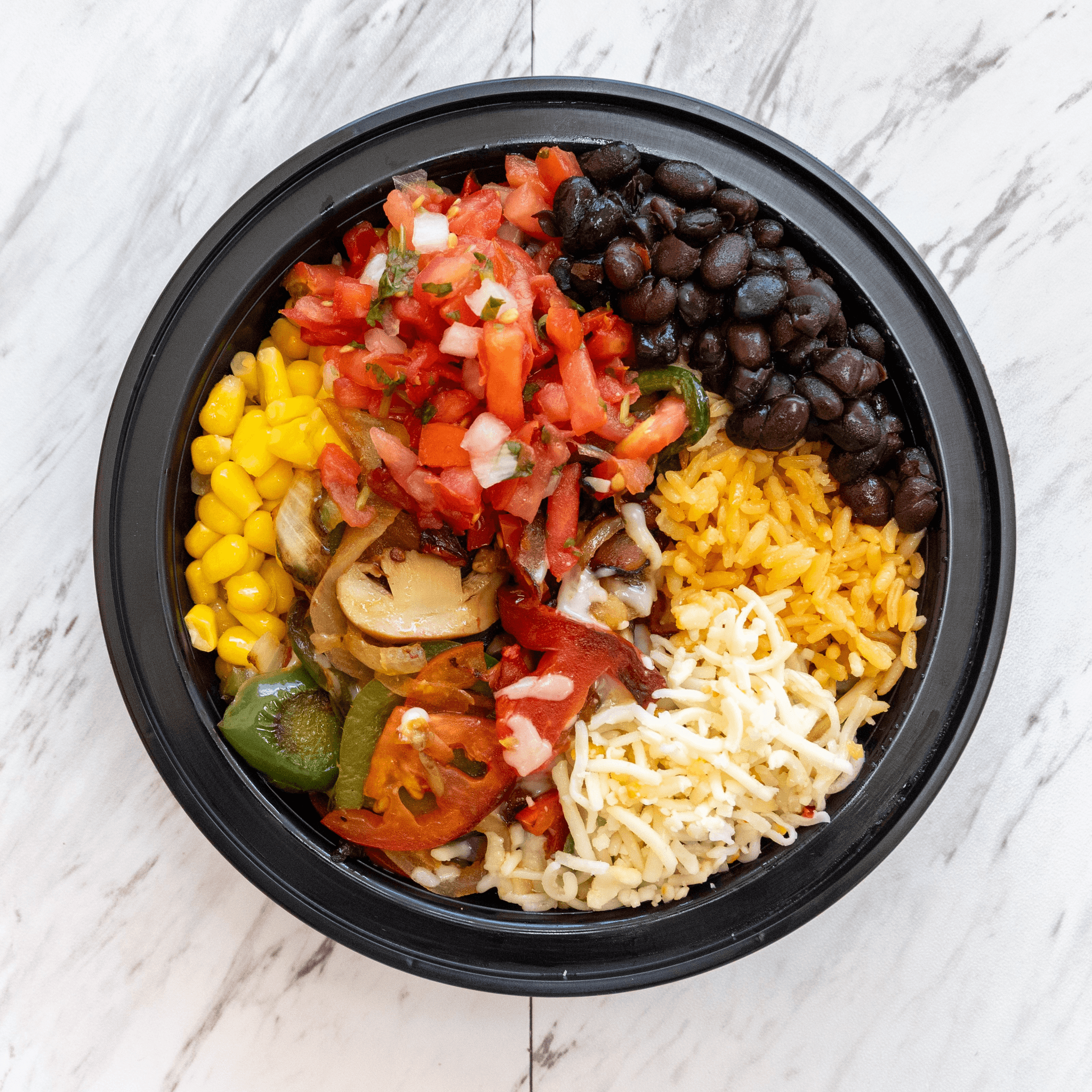 A flavorful bowl of rice, black beans, sweet corn, sautéed onions, peppers, and mushrooms, finished with melted jack cheese and fresh chopped tomato salsa.
