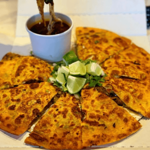 Two crispy flour tortillas filled with melted cheese and tender braised beef, fresh cilantro and diced onions, served alongside limes, pico de gallo, and rich consommé.