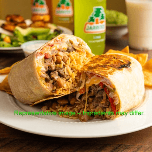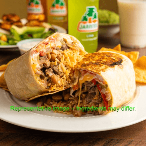 Flavorful steak combined with rice, pinto beans, corn, salsita, fresh guacamole, sour cream, fresh pico de gallo, and melted cheese — a true flavor feast.