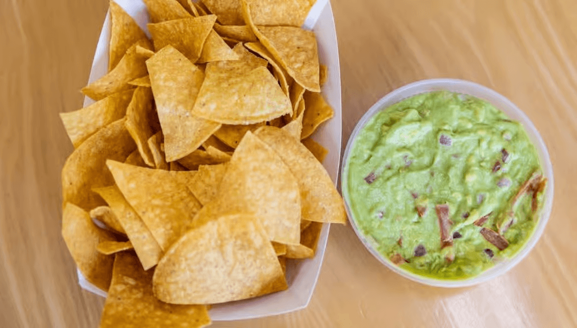 1/2 (half a pound) of fresh guacamole served with golden, crunchy corn chips.