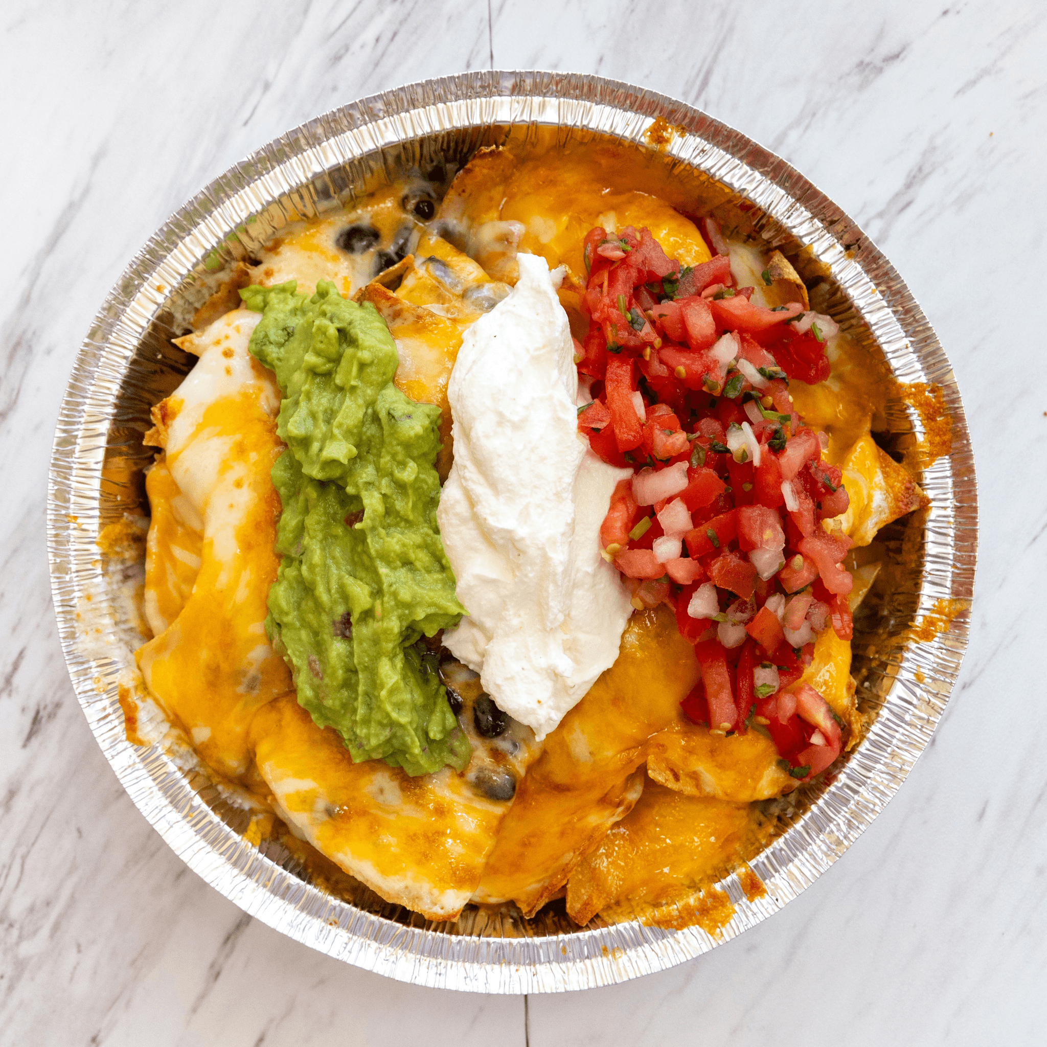 Crisp corn chips layered with black beans, with melted jack and cheddar cheese, topped with fresh guacamole, sour cream and fresh tomato salsa.