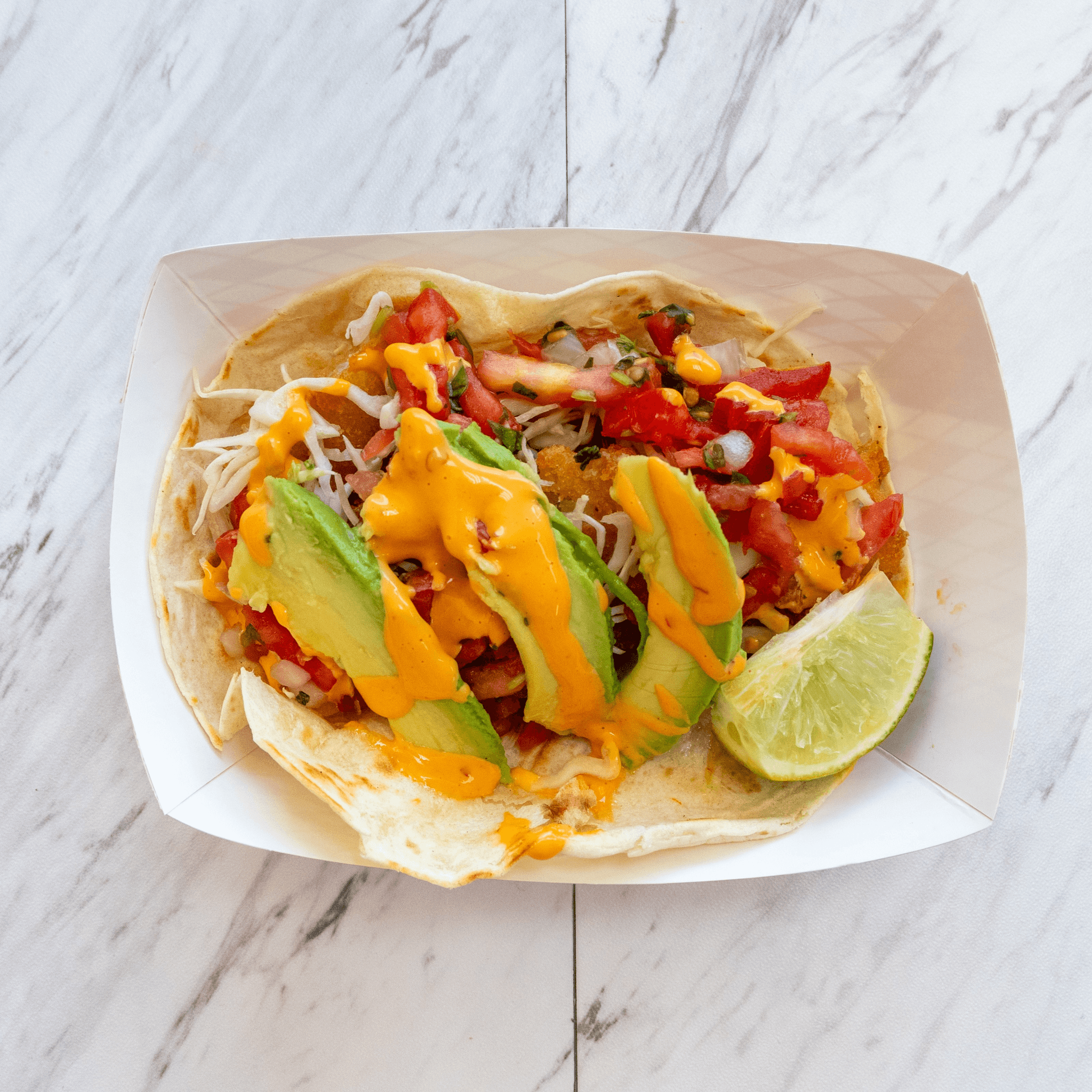Two tacos filled with crispy breaded red snapper, fresh guacamole, chipotle mayo, crisp lettuce, fresh tomato salsa, and jack cheese.