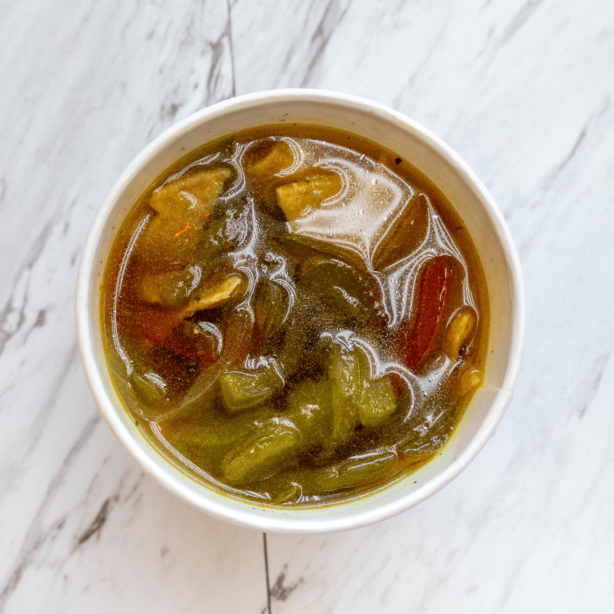 Juicy pulled chicken pieces cooked with ripe tomatoes, onions, and peppers in a rich chicken stock.