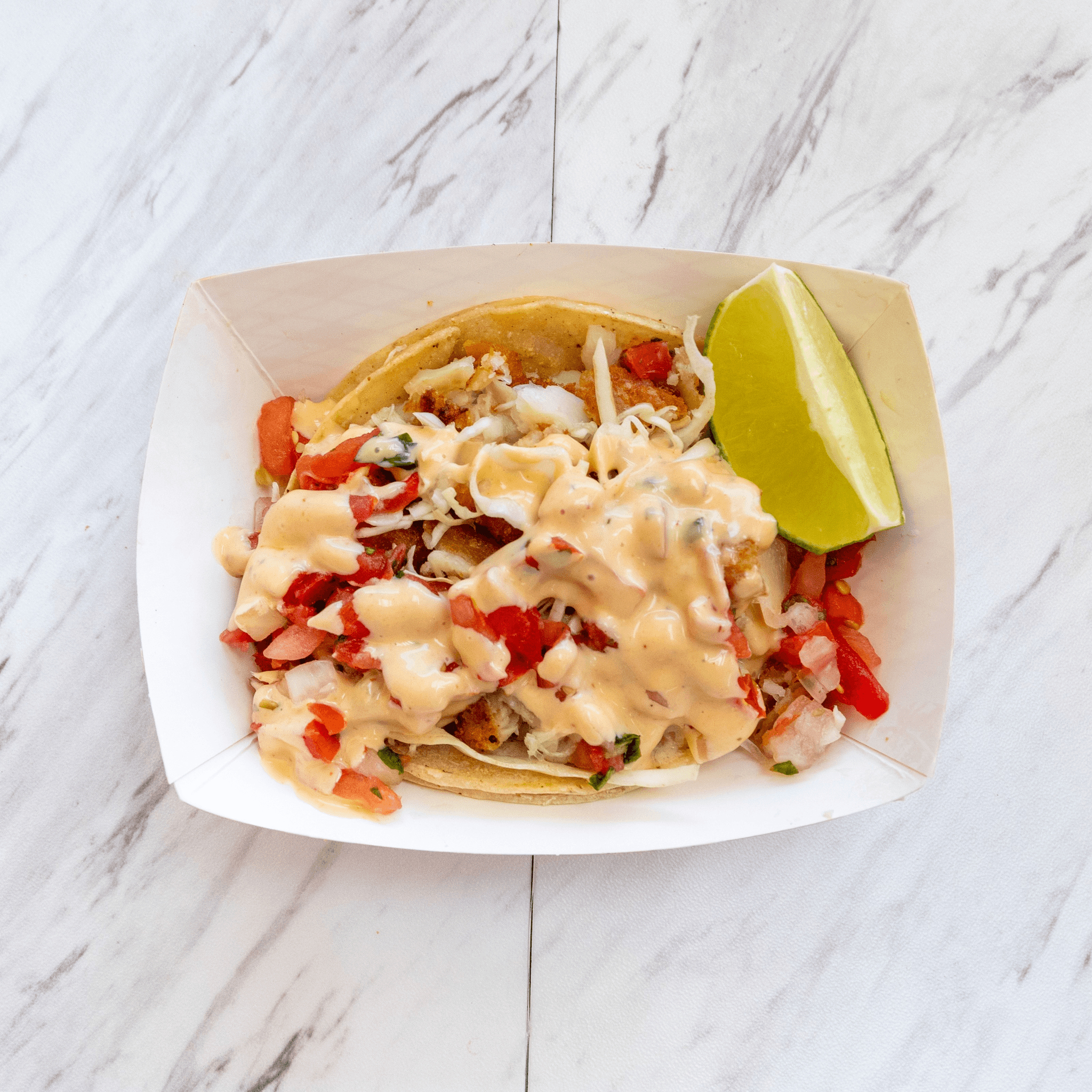 Crispy breaded red snapper in a corn tortilla with fresh tomato salsa, crunchy cabbage, and creamy house dressing.