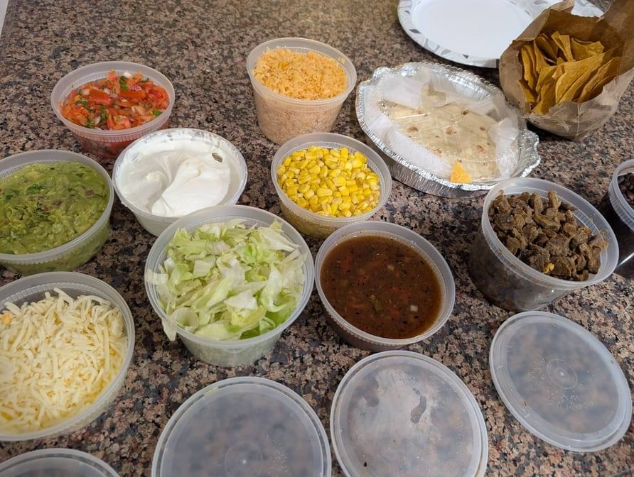 Enjoy a flavorful meal featuring your choice of chicken, steak, pulled pork, or chili meat, accompanied by rice, black beans, cheese, corn, fresh chopped tomato salsa, crisp lettuce, blue tortilla salsa, sour cream, fresh guacamole, chips, and a 2-liter soda, served with 10 warm 6" flour tortillas.