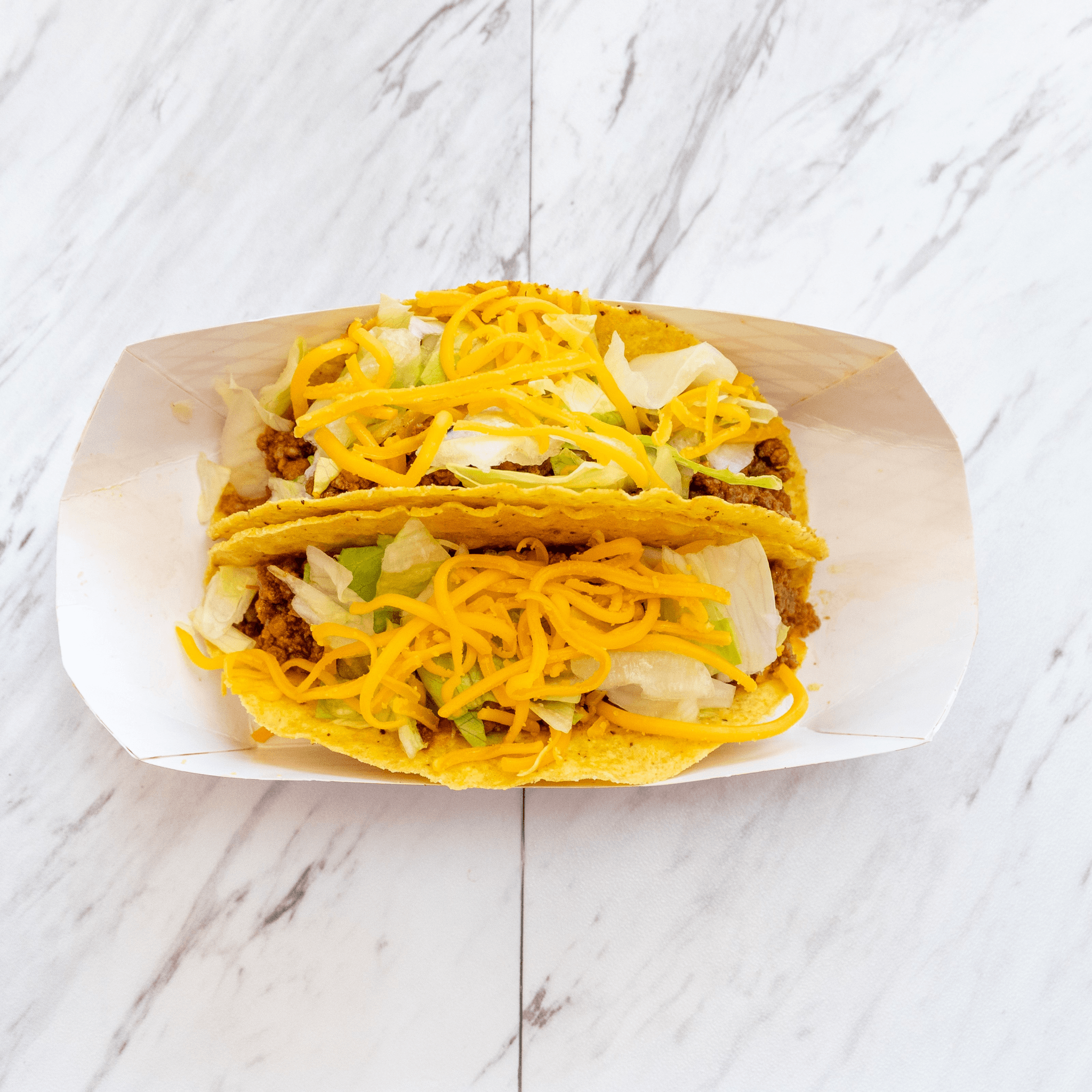 Two tacos filled with ground beef, fresh lettuce, and melted cheese.
