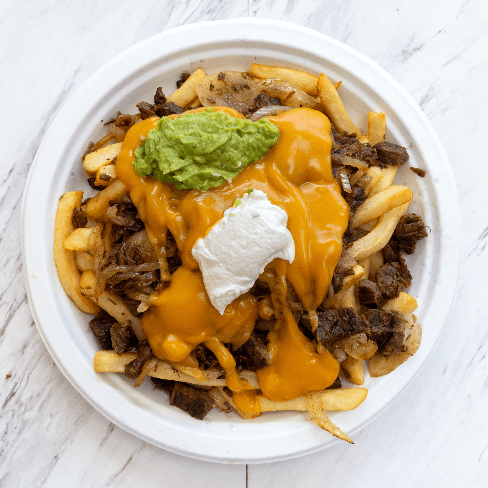 Golden fries layered with sautéed onions, juicy carne asada, nacho cheese, sour cream, and fresh guacamole.