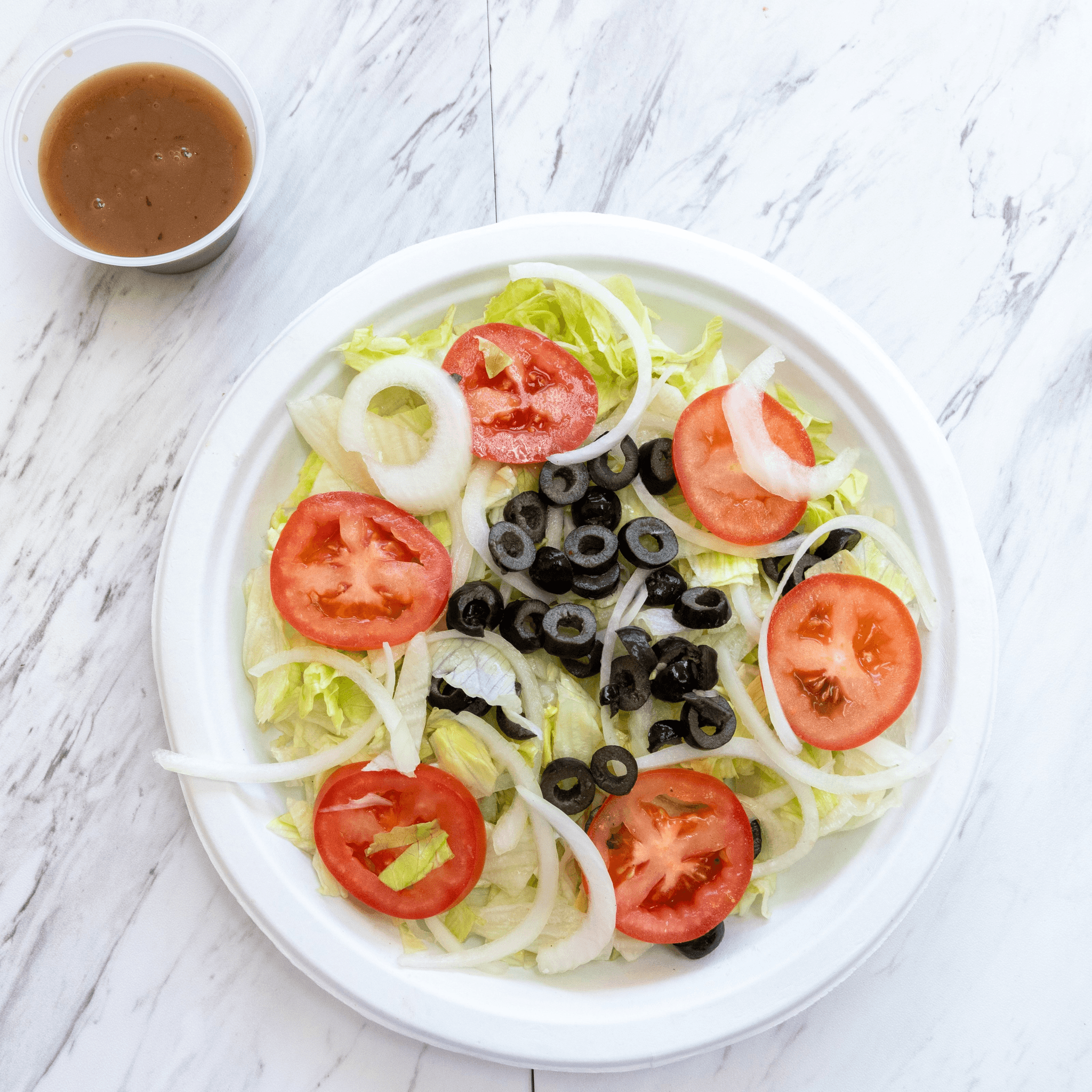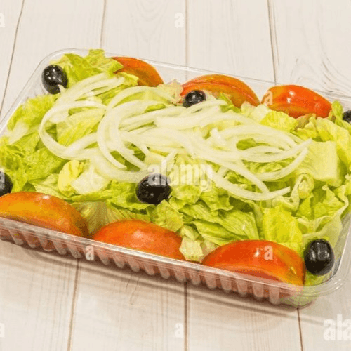 Lettuce, sliced tomatoes and sliced onions and a choice of dressing , golden italian or ranch dressing.