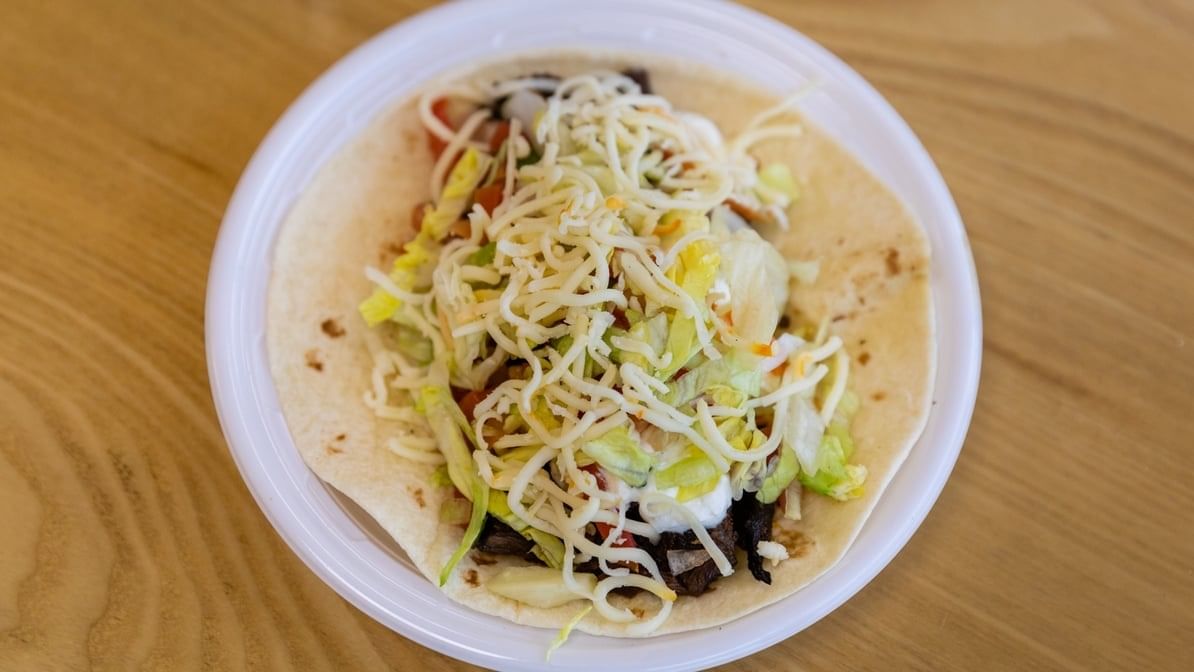 A soft flour tortilla layered with crisp lettuce, cheese, sour cream, and fresh chopped tomato salsa.