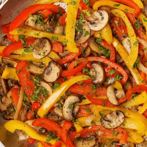 A medley of sautéed mushrooms, bell peppers, juicy tomatoes, and onions, layered with crisp lettuce, avocado, and zesty vinaigrette dressing.
